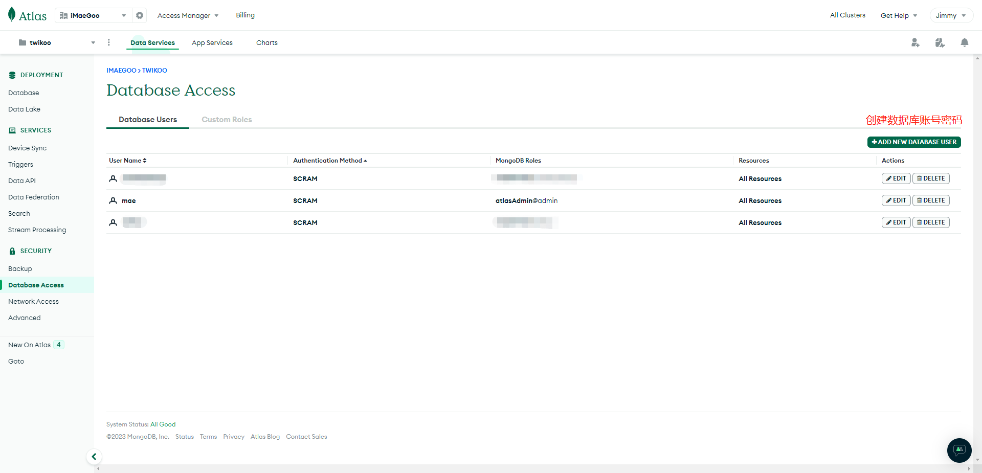 3.点击Database & Network Access,在Database Access 页面点击 Add New Database User 创建数据库用户,Authentication Method 选 Password,在 Password Authentication 下设置数据库用户名和密码,建议点击 Auto Generate 自动生成一个不含特殊符号的强壮密码并妥善保存。点击 Database User Privileges 下方的 Add Built In Role,Select Role 选择 Atlas Admin,最后点击 Add User