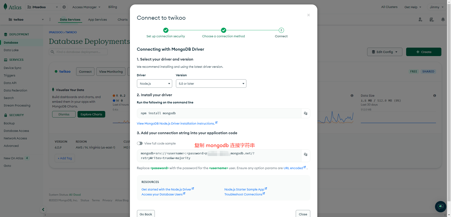 5.在 Database 页面点击步骤2创建的集群,点击 Connect,连接方式选择 Drivers,并记录数据库连接字符串,请将连接字符串中的