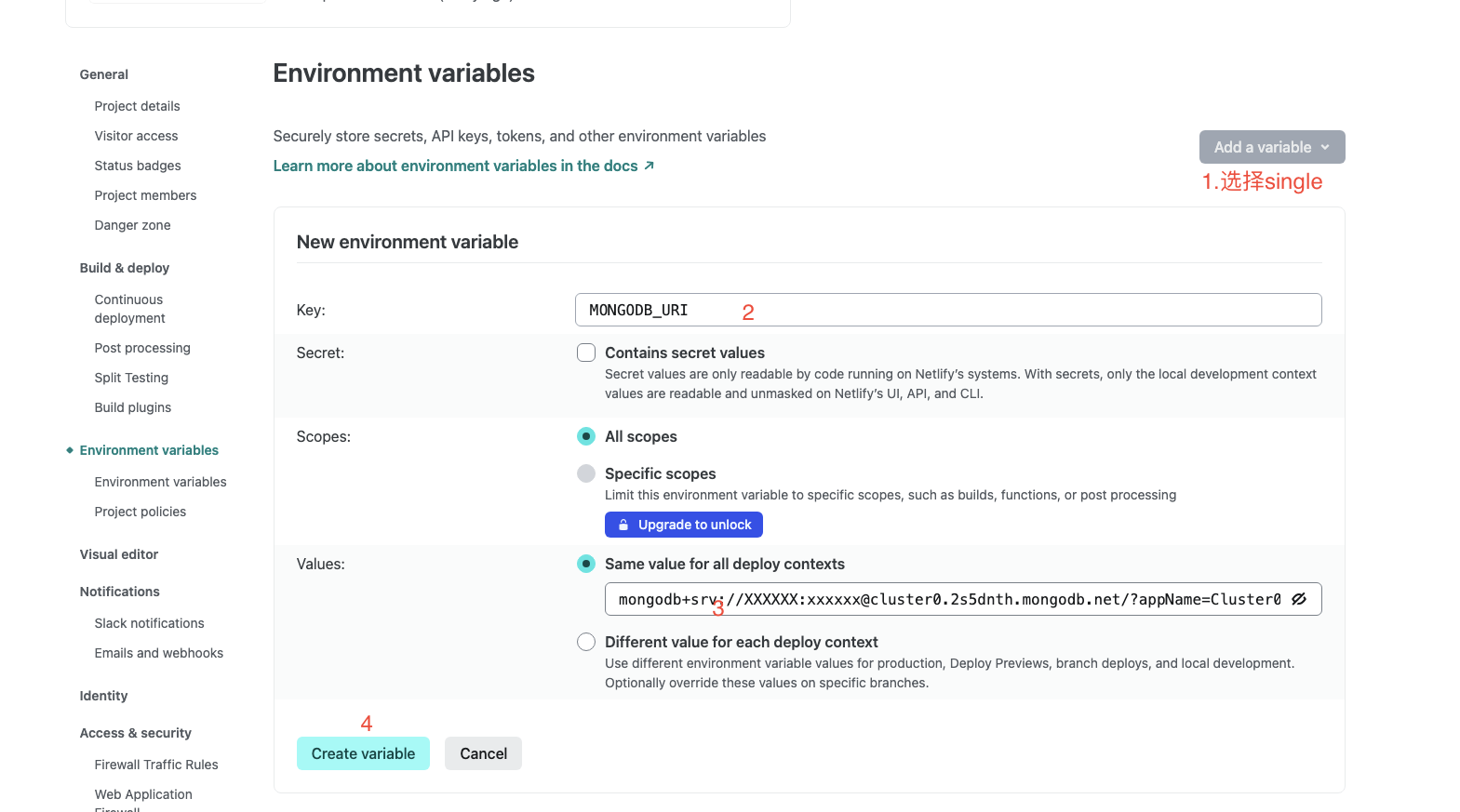 7.当MongoDB数据库申请完成,并配置好数据库用户密码及连接字符串后;进入部署的Project,选择Project configuration,点击 Add environment variables - New variable,Key 输入 MONGODB_URI,Value 输入前面记录的数据库连接字符串