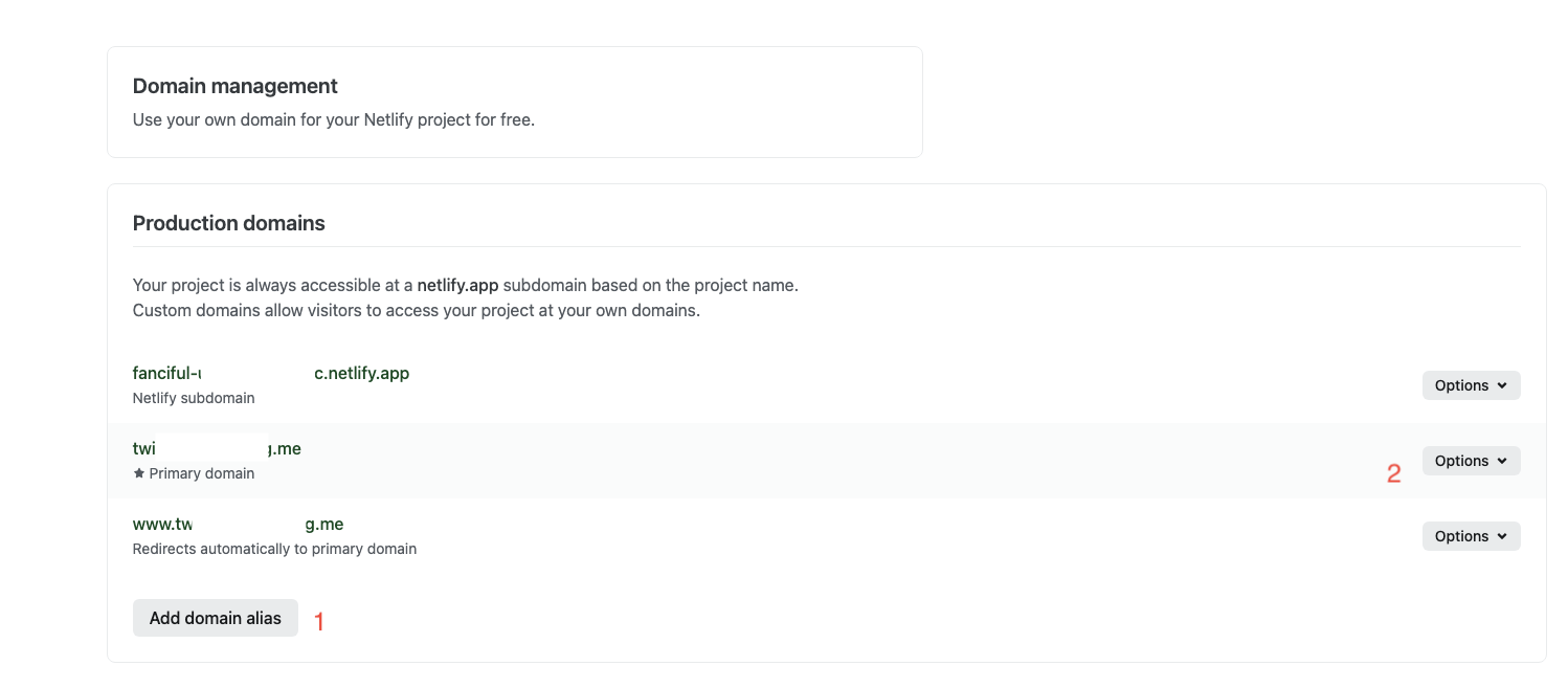 8.域名配置,点击Domain management,进入Production domains - 右侧 Options - Edit site name,可以设置属于自己的三级域名(https://xxx.netlify.app)
