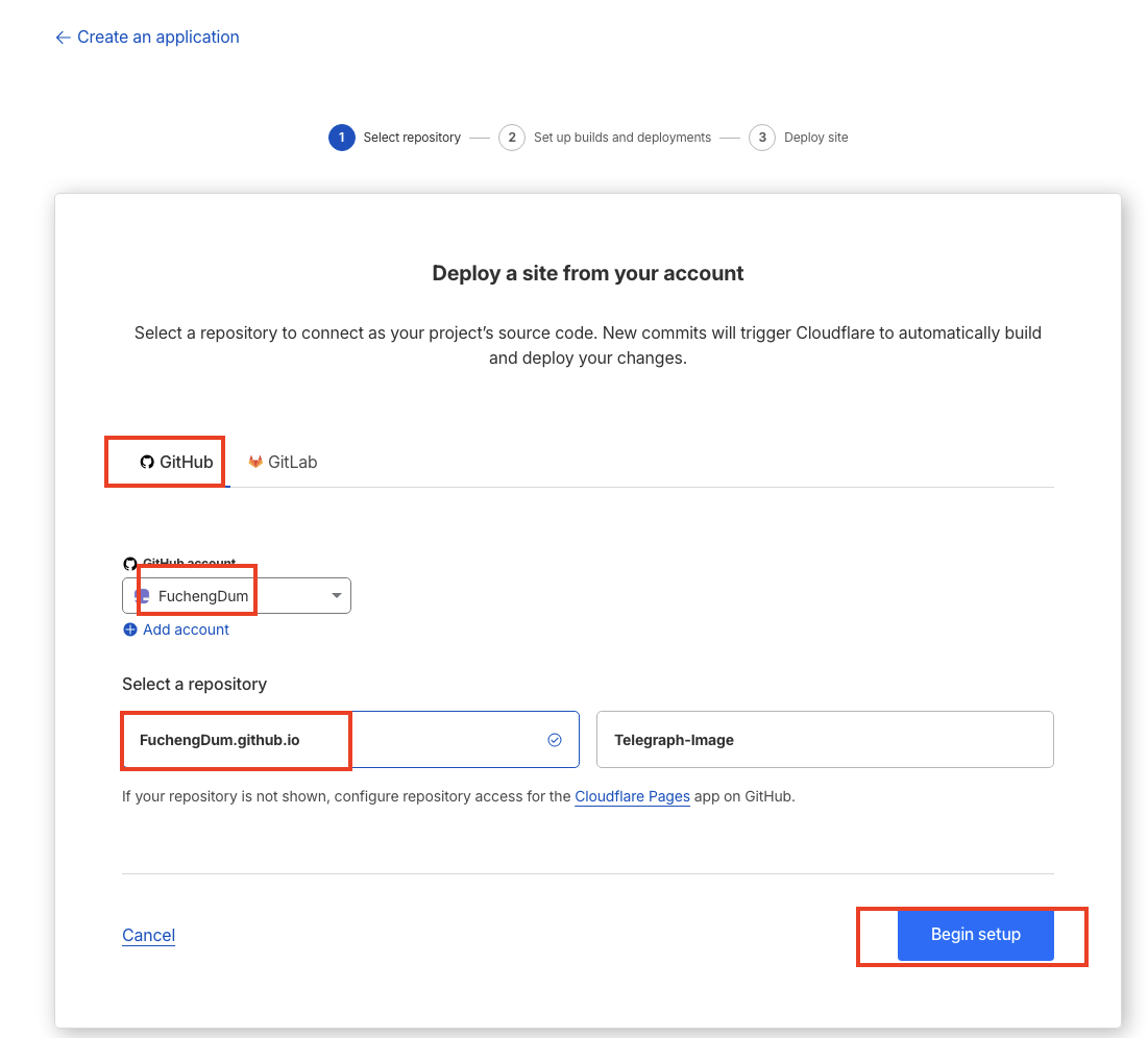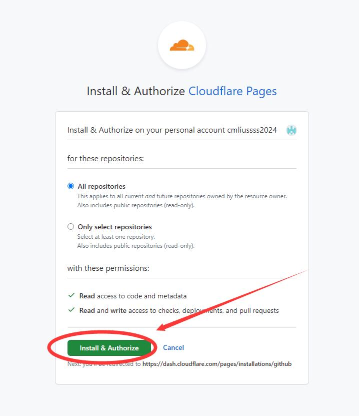 选择并连接到 Git 程序,如果没有绑定过GitHub账号,请参考下图先绑定,并选择需要部署的仓库,默认可以选择开放所有仓库