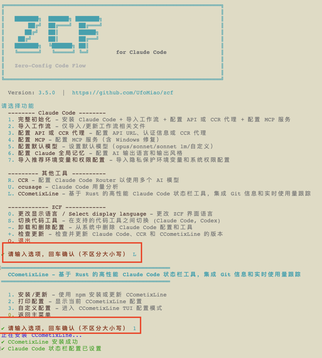 根据交互菜单,输入对应的选项使用对应的功能,这里安装一个ClaudeCode状态栏工具输入L,按照提示进行对应操作