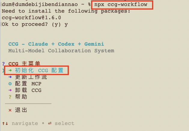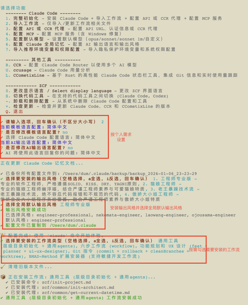 执行npx zcf 会打开交互菜单,指导你安装和更新。